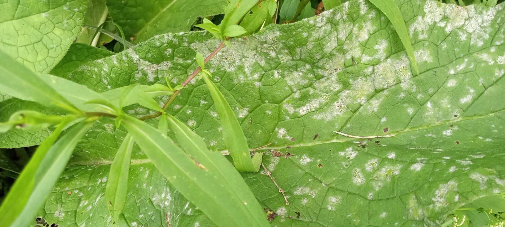 No known diseased. White powdery mildew, (Golovinomyces cynoglossi ~ a species of fungus/ mildew) [ ], will sometimes form on the leaves as the plant matures during the growing season. High humidity in the environment may cause the mildew to form. This mildew is unsightly and scary, but very common and harmless to the Comfrey plant. When this happens it is a sign that it is time to cut the mature plant back to allow its new growth. to thrive New growth happens quickly. Depending on what you are using your comfrey for, and how tall you want it to get, Comfrey may be cut back two to three times or more during one growing season. Mildew does not effect or show up on the new growth. Mildew is common in Comfrey. Most people use the cut leaves and stems as usual with no problem. I personally have never had the mildew spread to any other plant or vegetable, even with the Comfrey very close by it. ( This mildew is common to plants in the boraginaceae family, ie: Forget Me Nots, so perhaps be careful around plants in this family.)