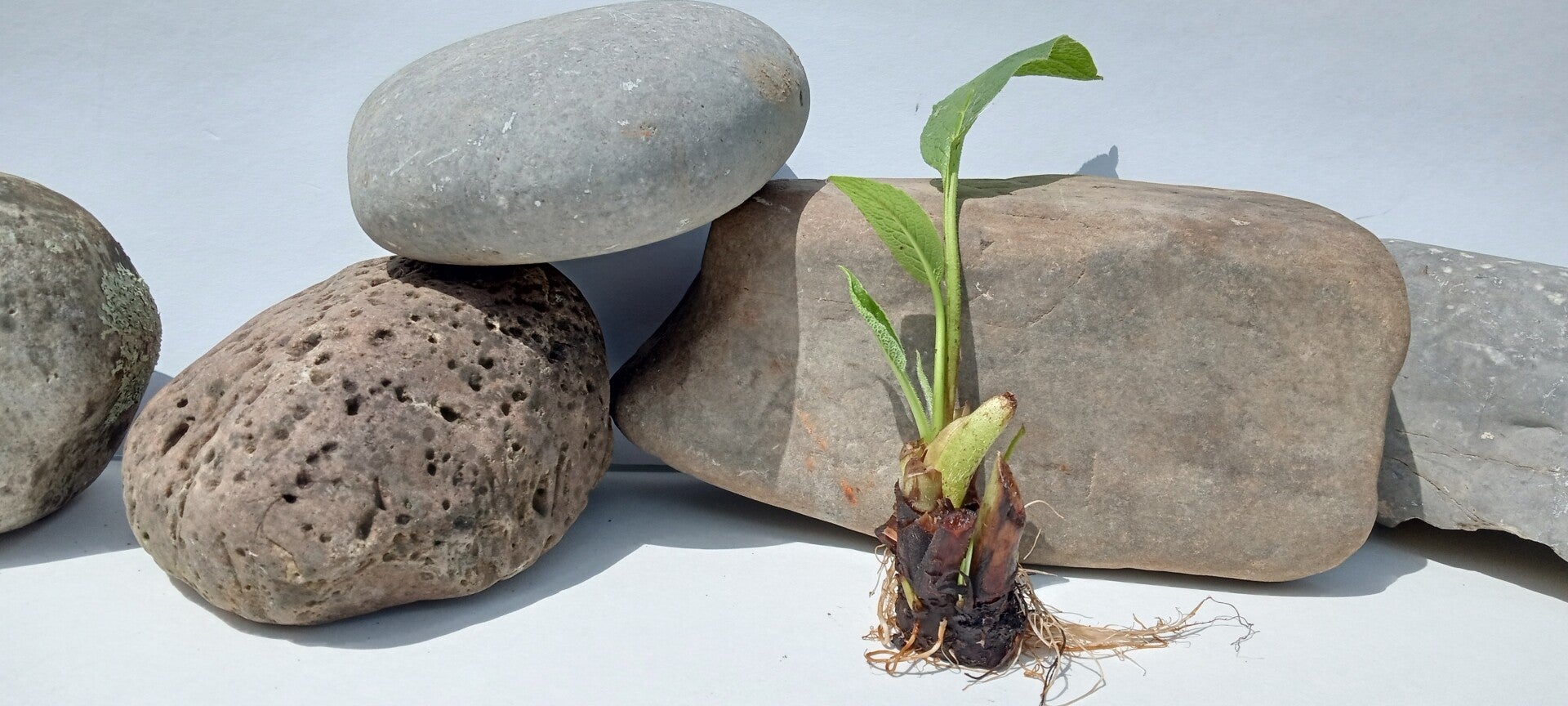 4) Comfrey has a tap root system with deep running lateral rhizomes. The tap root is renowned for its exceptional ability to reach deep into the earth. Reportedly the famous vertical, mature tap root burrows deep into the ground, horizontally, reaching 8' to 10' depths. The deep reaching tap root allows Comfrey access to vitamins and minerals that lay deep within the earth. These valuable properties are taken in and circulated throughout the plants stem and leaf system. The stem and leaf wilt, fall to the ground and decay during their natural fall-winter slumber. Once decayed the valuable vitamins and minerals within the stem and leaf structures are released providing a green manure for the surrounding soil.