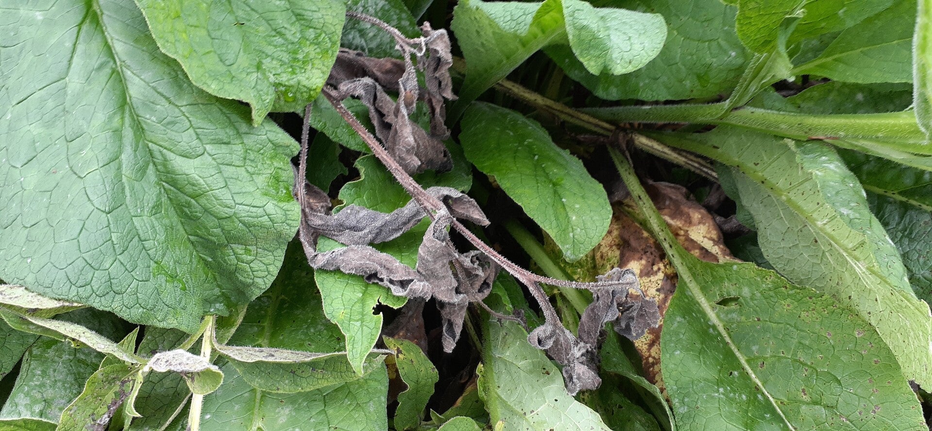 At the end of each season the last crop of Comfrey is left in place to droop, drop. wither, dry then decompose. The final growth creates a thick winter blanket for the Comfrey plant roots and also provides a winter home for insects that hibernate beneath leaf matter.